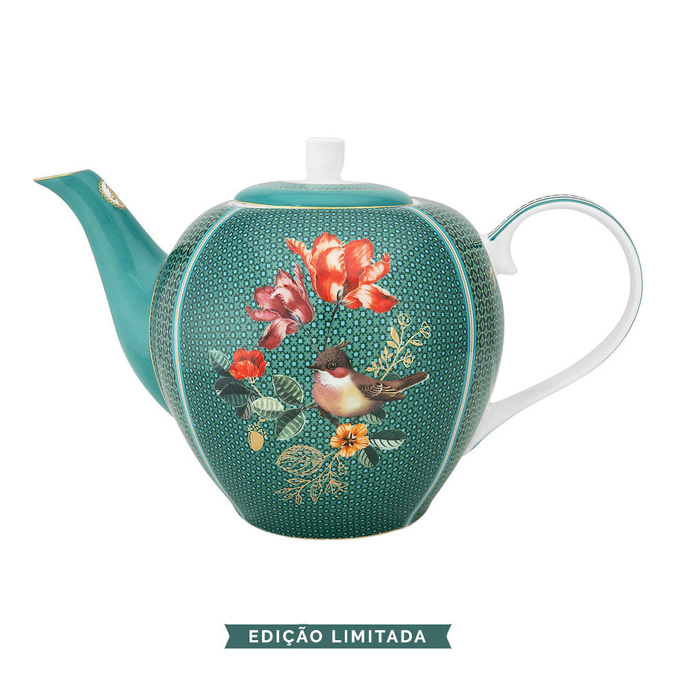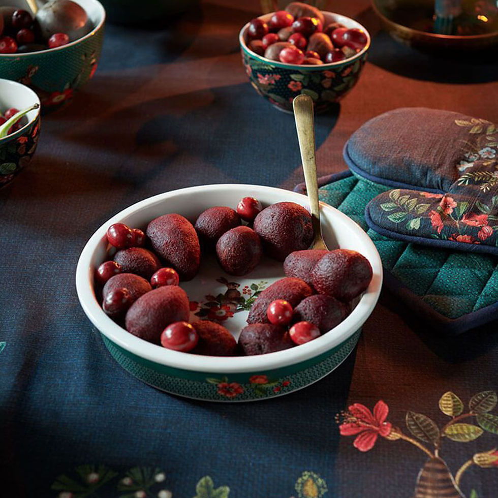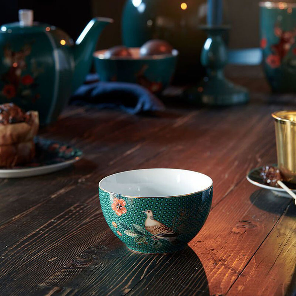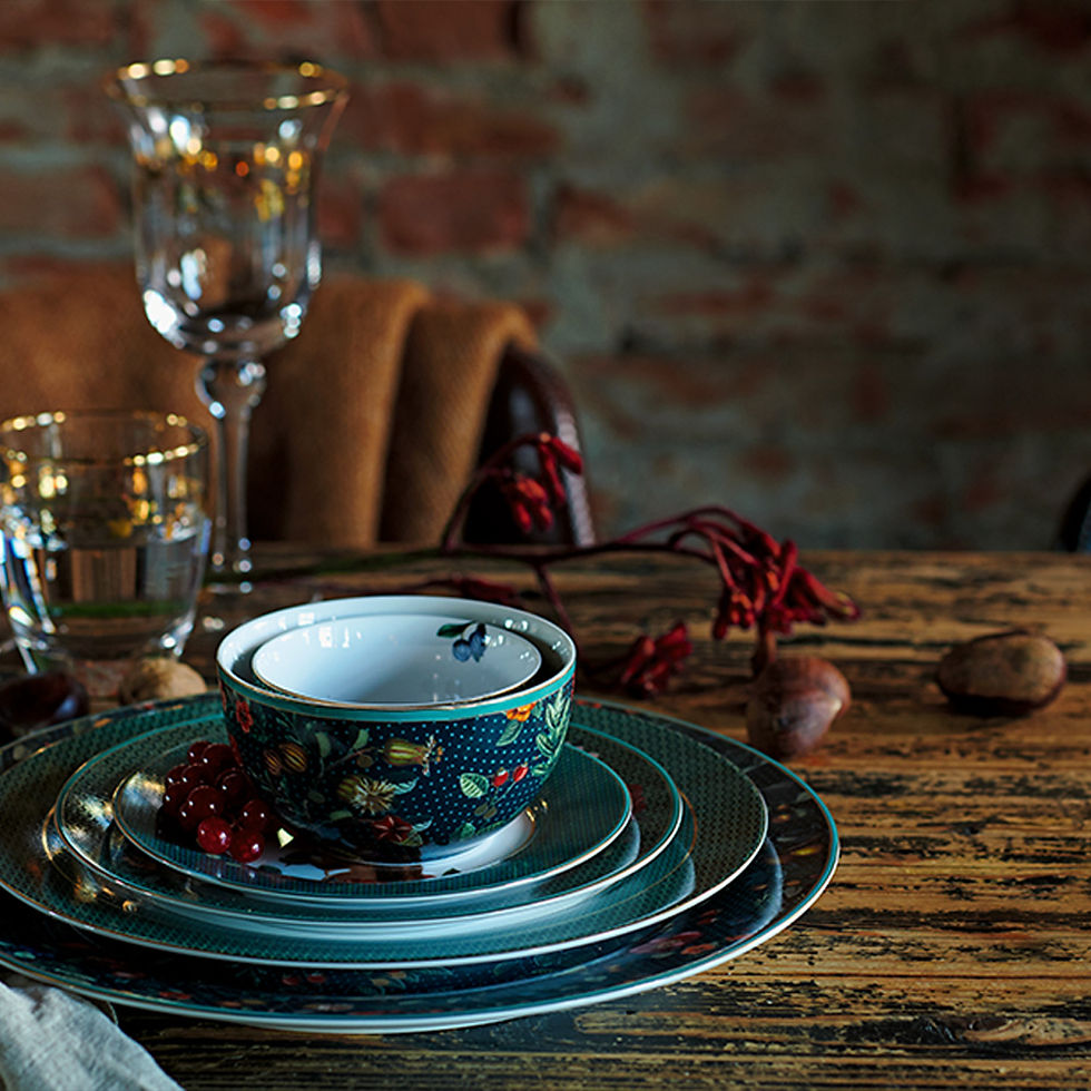 A coleção tem cores verdes escuras quentes, combinadas com bordas turquesa frescas e vermelhos profundos e ocres nas flores, que dão um toque rico e aconchegante à sua mesa de jantar.
